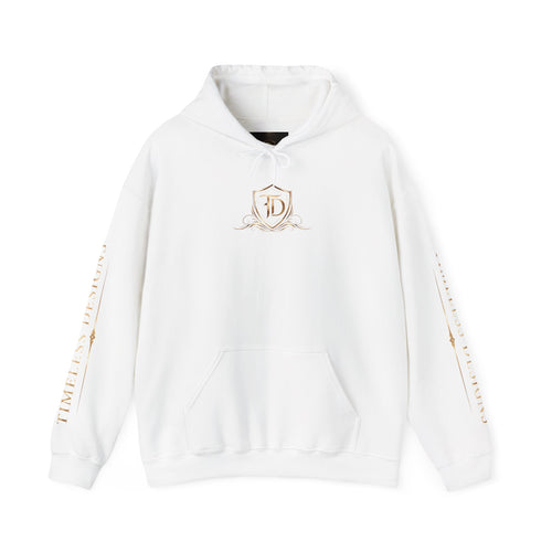 Timeless Designs Logo Hoodie — Elegant Pullover with Gold Crest -